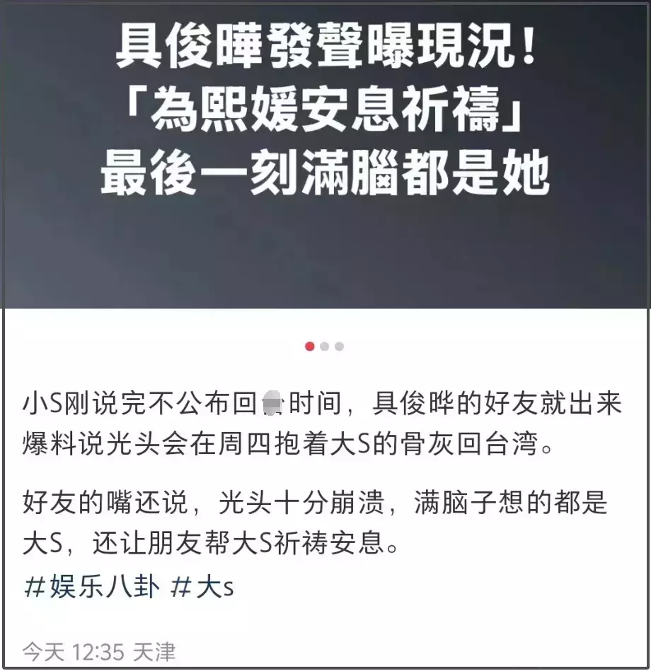 就看台媒报道,都能察觉到他们隐隐约约站了队,不光是媒体还有业内,那些和大S熟悉的、不熟悉的亲朋好友,一个个都出来表态了。