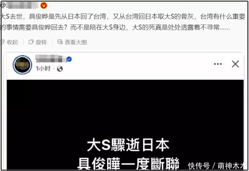 一次是大S身后事,S家先是把大S骨灰放豪宅,又改口要树葬,具俊晔前期不表态,临近下葬突然站出来反馈,希望大S能够土葬。