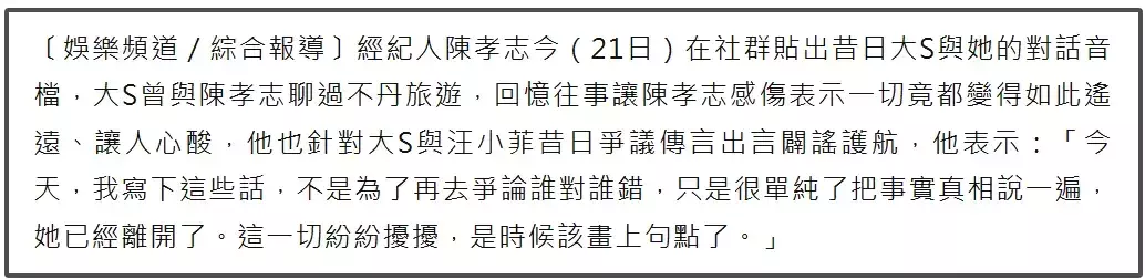 与吴佩慈、霍建华等人有过合作的台娱金牌经纪人陈孝志就站在了S妈这边,他曝光了大S生前录音,力挺S妈称她不爱钱,甚至不肯叫具俊晔的名字,只管他叫韩国人。