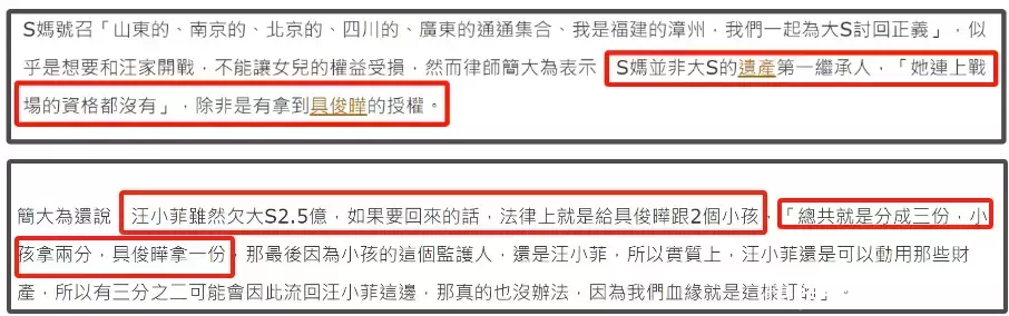 已经有律师出面分析了S妈面临的窘境,第一,她需要具俊晔授权才能参与遗产官司;第二,就算汪小菲愿意给钱,也没有S妈的份,倒是具俊晔有可能分走三分之一。