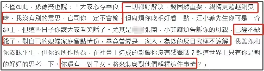 更微妙的是,陈孝志也喊话了汪小菲,和台娱大佬孙德荣表露出的意思几乎一模一样,那就是“孩子带走、钱留下”,希望汪小菲不要再和S家争了,“这一切纷纷扰扰,是时候画上句点了”,几乎就是明示汪小菲只要给钱,S妈就不会开战了。