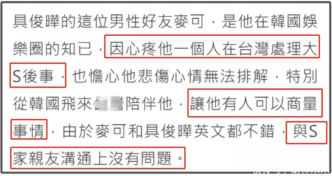 最重要有关大S遗产部分,台娱大佬和业内力挺S妈帮她向汪小菲喊话,具俊晔也有应对,他直接从韩国摇人了,还通过台媒放风向,一边爆料自己暴瘦6公斤很悲伤,一边提到韩国过来的好友英文很好,可以一起和S家沟通,过来协助具俊晔处理大S身后事——这下S家就不能用语言不通把具俊晔排除在外了,毕竟小S二女儿都说自己的母语是英文哦。